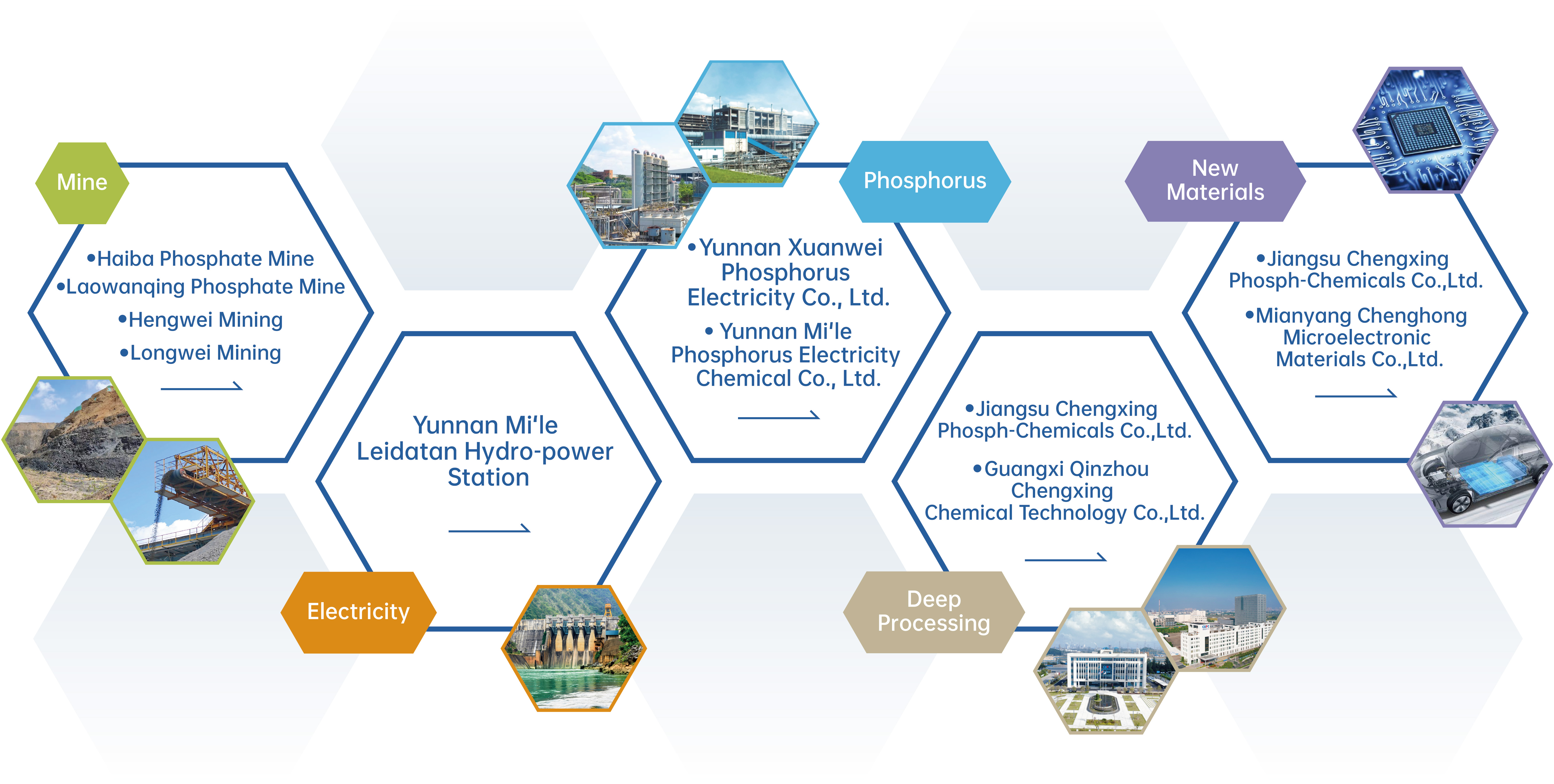CXPC adheres to the development strategy of "focusing on phosphorus, developing in concentric circles and circular pattern, moving towards higher and deeper levels, and extending to both ends", and has built an independent and complete phosphorus chemical industry chain from raw material mines to yellow phosphorus, phosphoric acid and phosphates, and is actively evolving into the field of new materials.